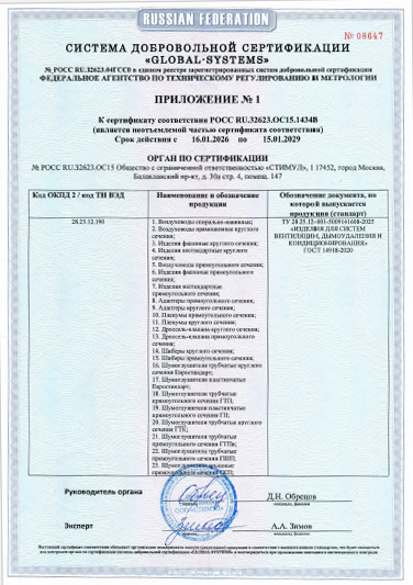 Согласно сертификату, завод «ВентСистемс» производит следующую номенклатуру изделий для систем вентиляции, дымоудаления и кондиционирования: